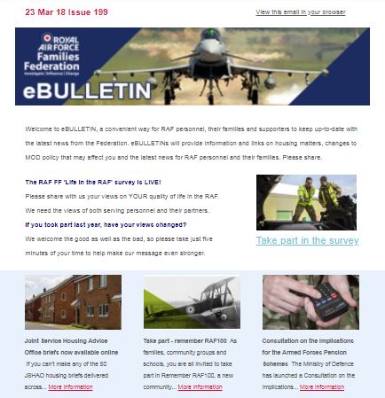 26 March 2018 Royal Air Force Families Federation Children, Families, RAF, Royal Air Force, Transition, Welfare RAF Families Federation – Weekly Newsletter Follow this link for all the latest news from the RAF Families Federation.