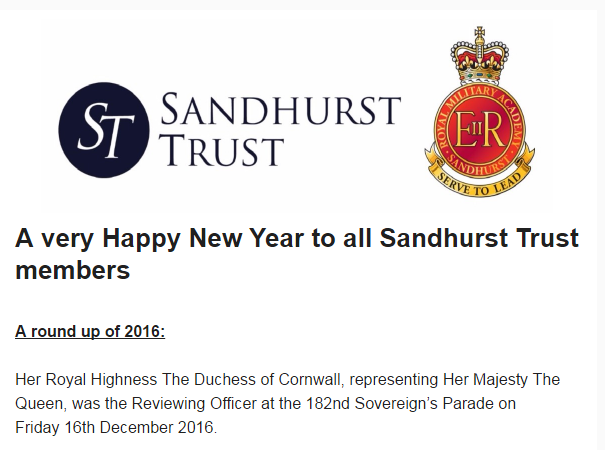 19 January 2017 Sandhurst Trust Army, Courses, Education, Newsletters, Serving Sandhurst Trust Newsletter Follow this link for all the latest news from the Sandhurst Trust.