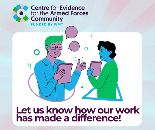 At the Centre for Evidence for the Armed Forces Community, funded by FiMT, we want to ensure we are working towards achieving our vision of ensuring evidence is at the heart of decision-making to enable a thriving Armed Forces community.